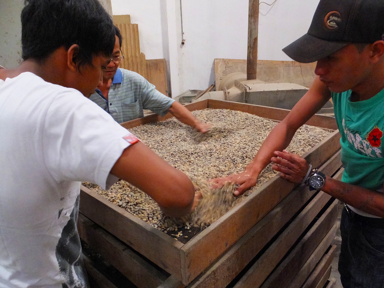 DSCF3509脱殻直後の生豆。再びメッシュトレーに戻す